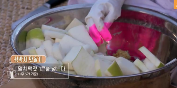 무 3개 기준일 때 소금 1컵을 넣어서 절인다.