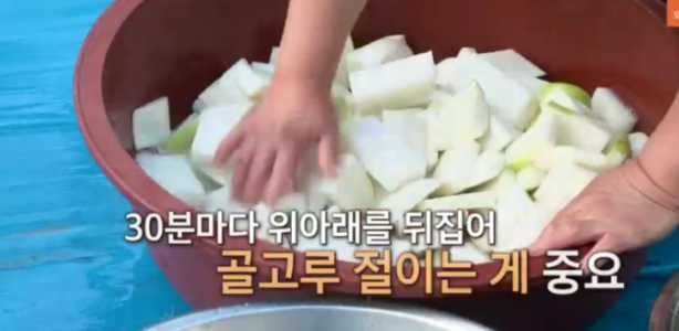 가운데 부분은 손을 이용해 물을 살짝 끼얹는다. (빨리 절여야 할 때는 소금양을 더 추가한다)