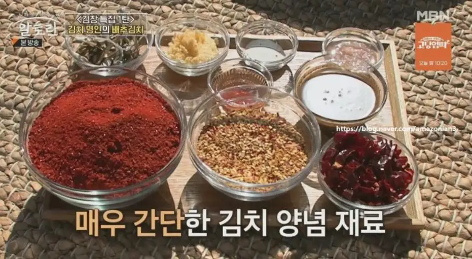 마른 멸치 약 30마리 (멸치 가루 1컵), 다진 마늘 반 컵(*1포기당 6큰술), 스테비아 1큰술, 새우젓 2큰술(*절인 배추 상태에 따라 가감), 고추씨 2컵, 진 젓 반 컵, 액젓 2큰술 반, 고춧가루 한 근(약 500g), 마른 고추 15개, 다진 생강 1큰술