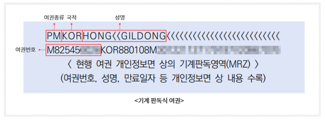 기기계판독영역은 출입국 심사 시 기계가 읽어내는 부분으로 여권의 개인정보면 하단에 여러가지 로마자, 숫자, 꺾쇠표시가 규칙적으로 표시되어 있습니다. 이 영역에는 여권번호, 성명, 만료일자 등 개인정보가 수록 되어 있습니다.