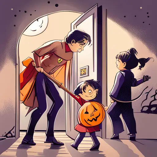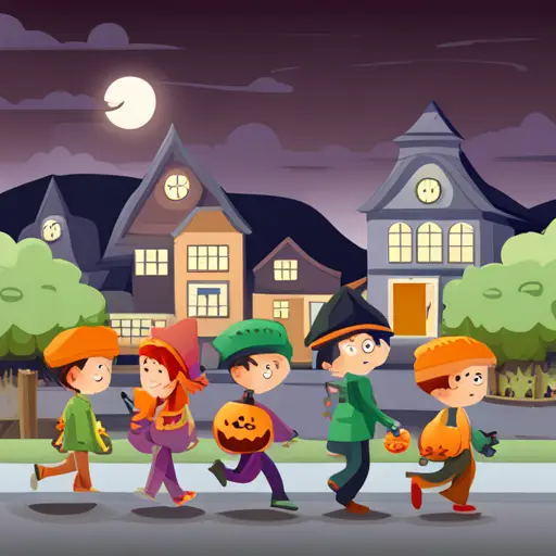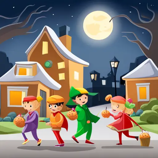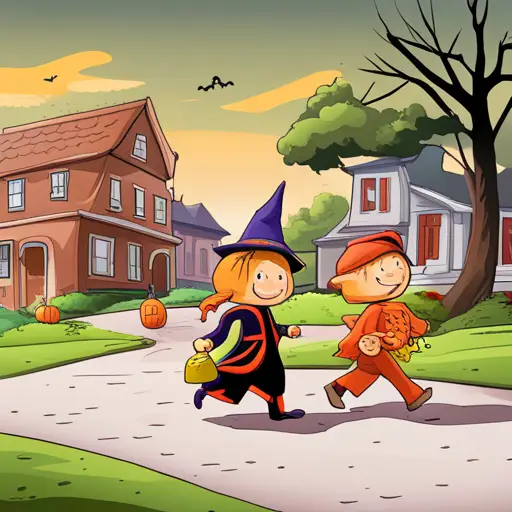 a. Trick or Treat: Young kids dressed in Halloween costumes, going door to door in the neighborhood, collecting candy. Pumpkins are also involved, and their faces light up with smiles.