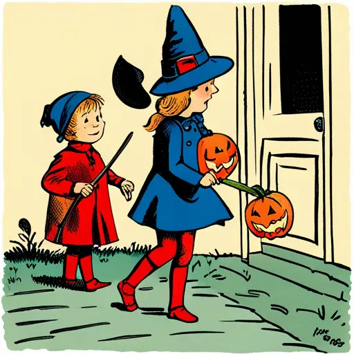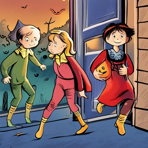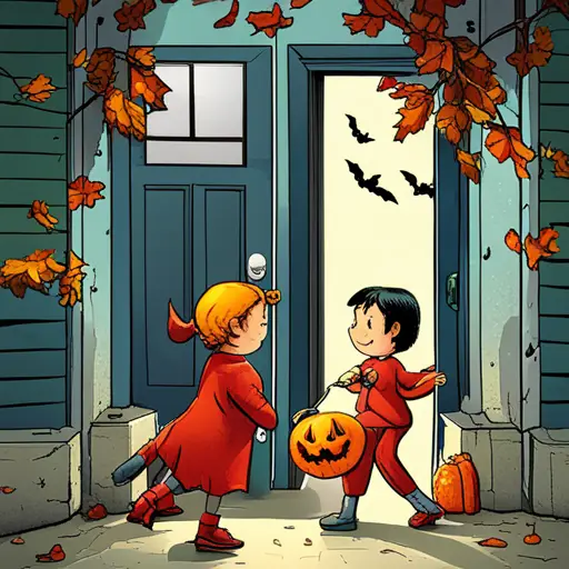 a. 아이들의 트릭 오어 트릿: 어린아이들이 핼러윈 코스튬을 입고 동네를 돌며 사탕을 얻는 장면을 그린다. 아이들은 호박과 함께 하고 있으며, 얼굴에는 미소가 지어져 있다.