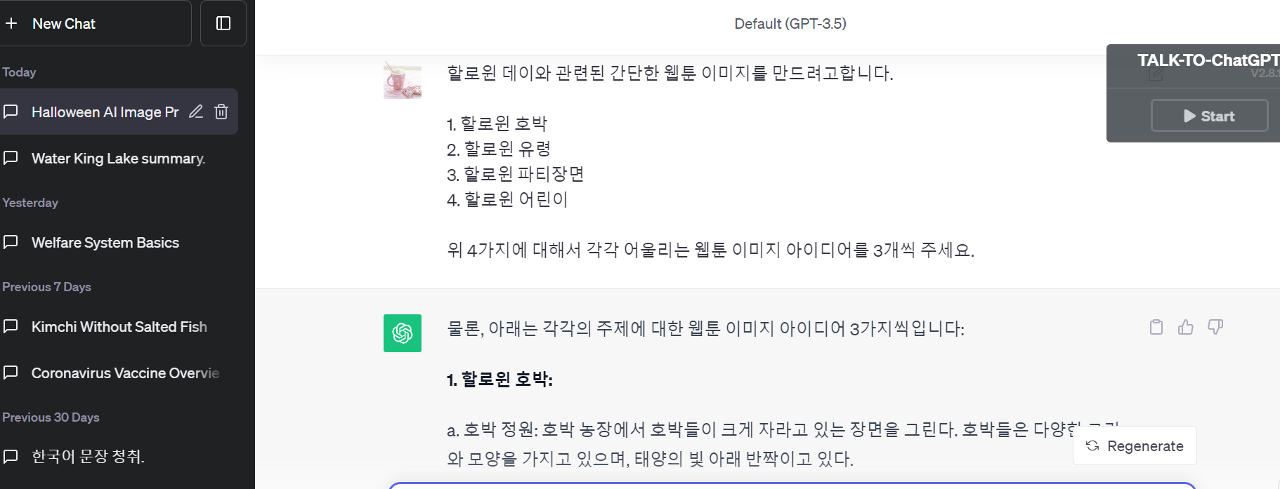 | --> 챗GPT에게 아래와 같이 물어봤습니다. 할로윈 데이와 관련된 간단한 웹툰 이미지를 만드려고합니다. 1. 할로윈 호박 2. 할로윈 유령 3. 할로윈 파티장면 4. 할로윈 어린이 위 4가지에 대해서 각각 어울리는 웹툰 이미지 아이디어를 3개씩 주세요. |