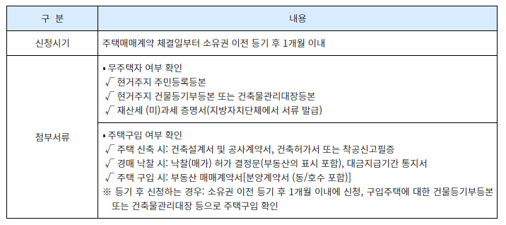 - 필요 서류: 주택 매수 계약서, 소유권 이전 등기 서류