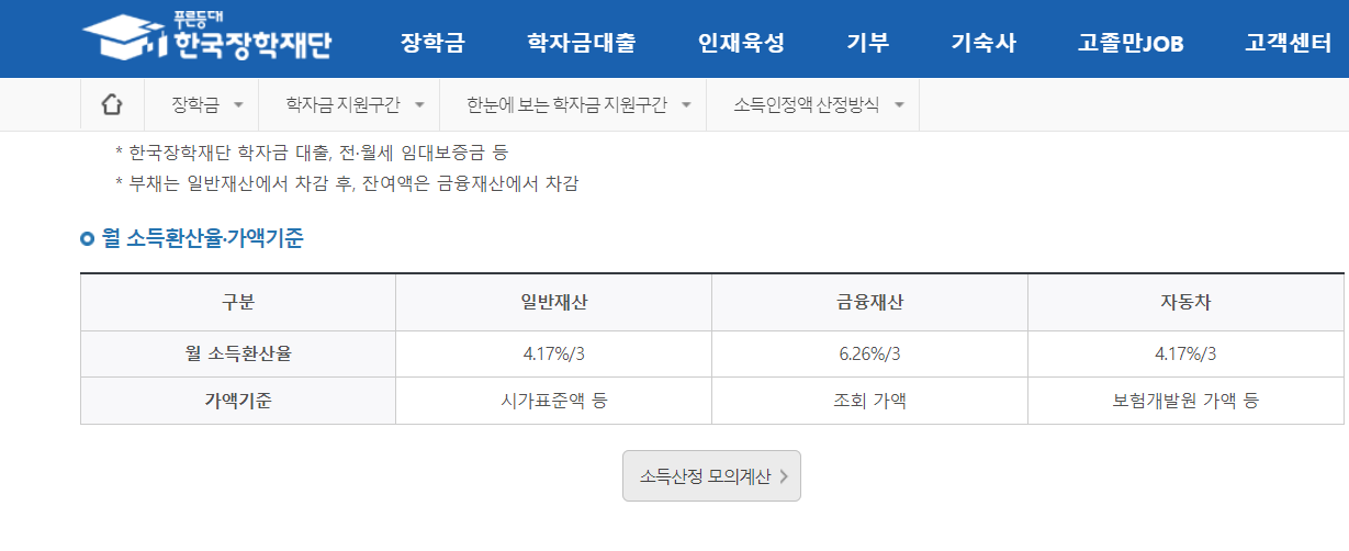 👉🏻 장학금 신청 시에 작성한 정보와 제출자료를 근거로 가구의 '소득인정액'을 계산합니다. 처음 보시면 계산방법이 복잡하게 느껴지실 것 같습니다. 계산방법이 궁금하신 분은 아래 글을 참고해 보시기 바랍니다.