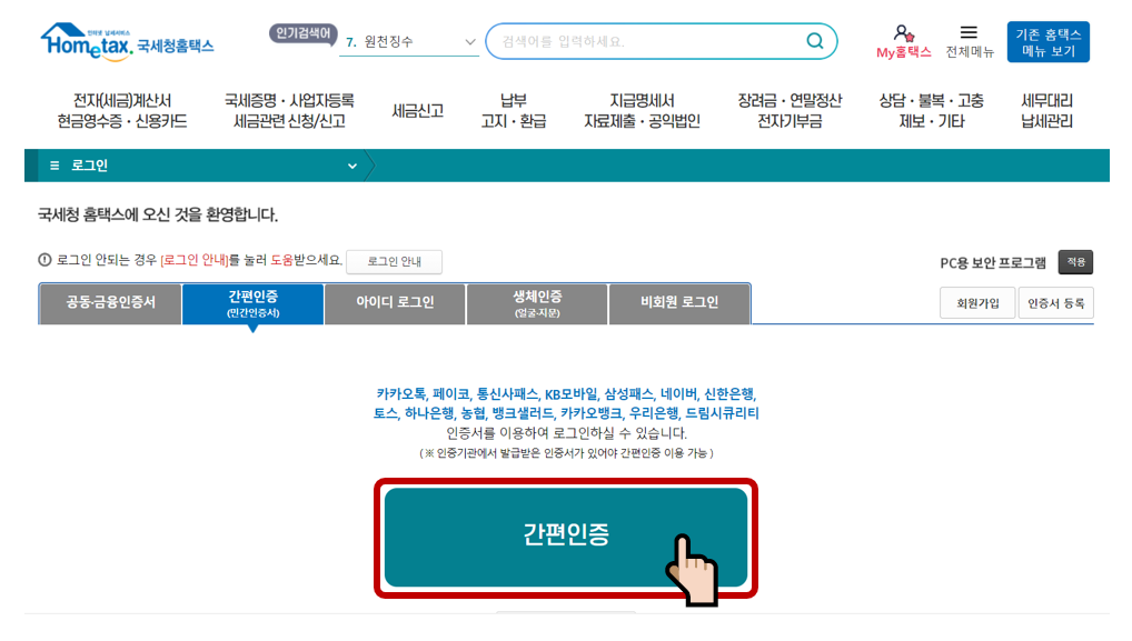 ✅ 홈택스 화면에서 로그인을 누른 후 간편 인증을 클릭합니다.