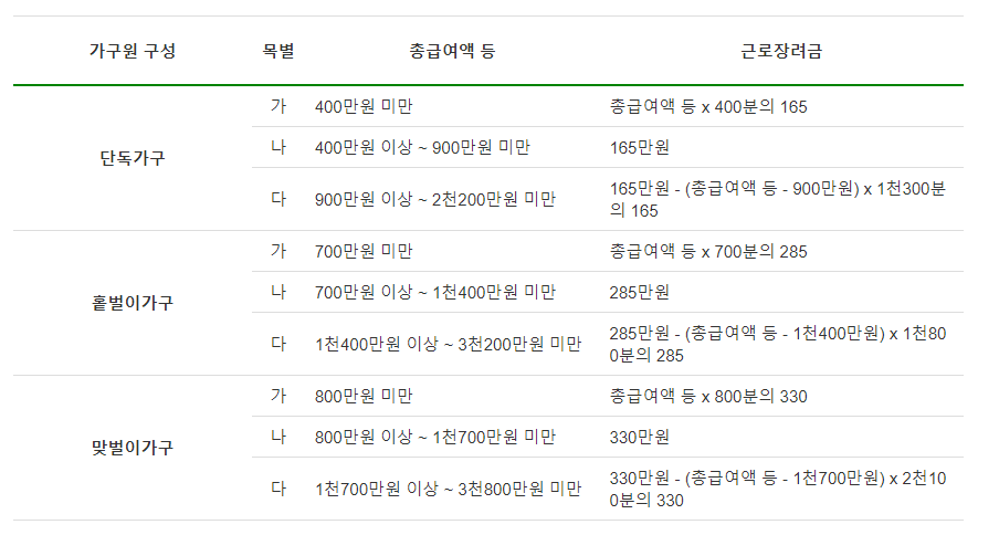 근로장려금 지급 금액 (가구별 기준)